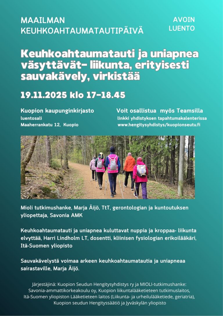 Keuhkahtaumatauti ja uniapnea väsyttävät - liikunta, erityisesti sauvakävely, virkistää