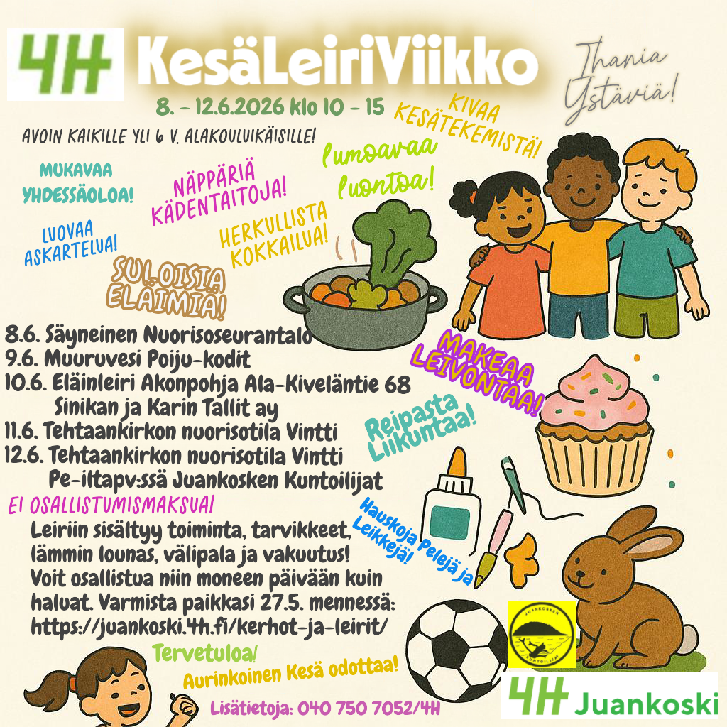 Juankosken 4H-yhdistys järjestää lasten KesäLeiriViikon viikolla 24. Leiriviikko järjestetään päiväleirinä klo 10 – 15. Leiri on avoin kaikille yli 6 v. alakouluikäisille. Leiripäiviä on Juankosken eri kylillä. Voit osallistua niin moneen leiripäivään kuin haluat. Leiripäivissä on tarjolla kivaa, monipuolista kesätekemistä!