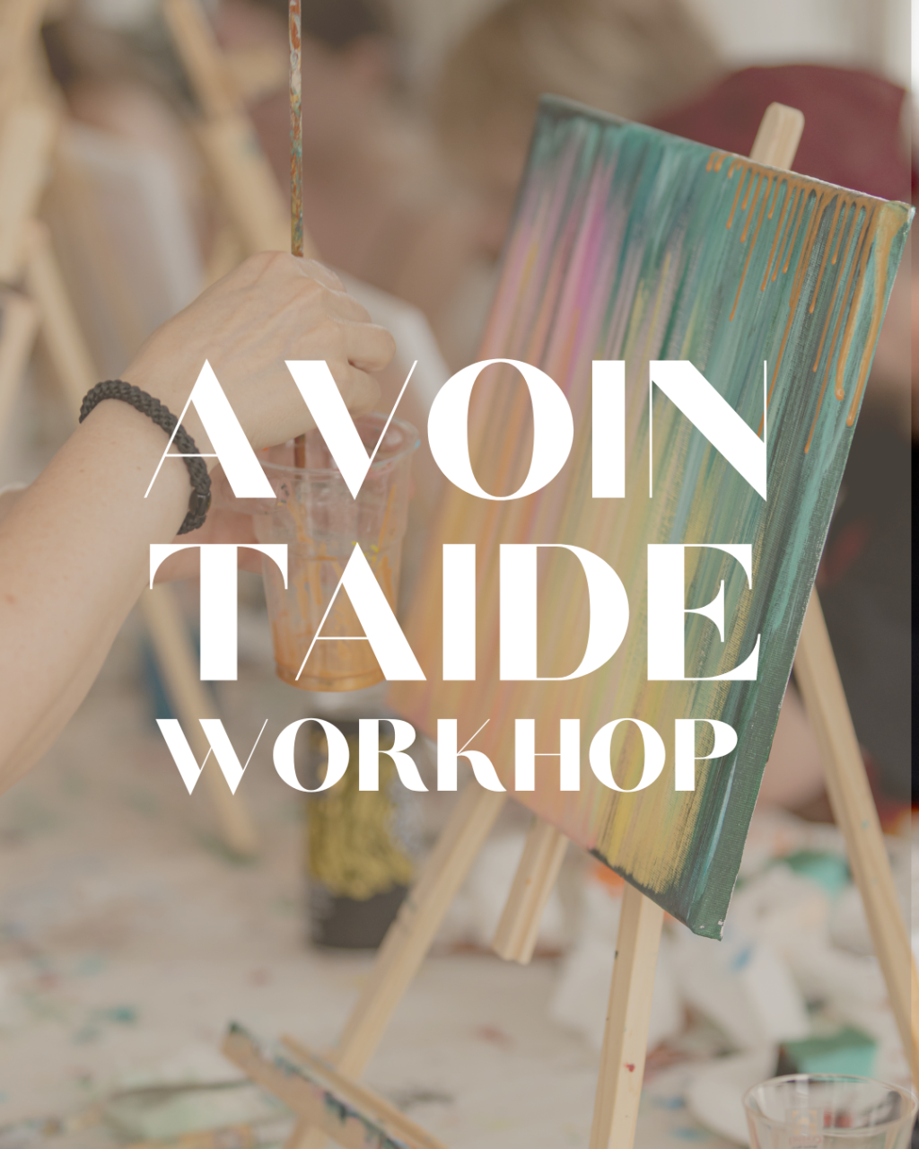 Avoimessa taide workshopissa annetaan luovuuden virrata! Saat käyttöösi laadukkaat taiteilijatarvikkeet, kokeilet rohkeasti erilaisia värejä ja tekniikoita – ja luot juuri sellaisen teoksen kuin itse haluat. Valittavanasi on viisi eri kokoista maalauspohjaa, joista voit valita mieluisimman, hinnat alkaen 25 €. Tulethan paikalle vähintään tunti ennen sulkemisaikaa, että ehdit maalaamaan rauhassa.