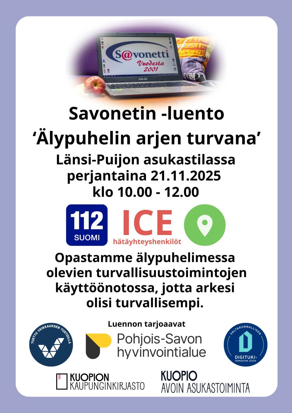 Älypuhelimessa on toimintoja, joilla voi parantaa omaa turvallisuuttaan arjessa. Sisältää 112-sovelluksen asennuksen ja käyttöönoton, sijainnin jakamisen, kun esim. ulkoillaan, marjastetaan, käydään sienessä tai hiihdetään luonnossa ja kuinka puhelimeen tallennetaan kriittiset terveystiedot hätätilanteen varalle, jotta ensihoito pystyy auttamaan oikein ja nopeasti onnettomuuden tai sairaskohtauksen sattuessa sekä että ensihoitajat saavat yhteyden lähiomaisiin, jotka ovat merkitty hätäyhteyshenkilöiksi puhelimeen hätätilanteen varalle. Tilaisuudessa avustetaan halukkaita näiden toimintojen käyttöönotossa.