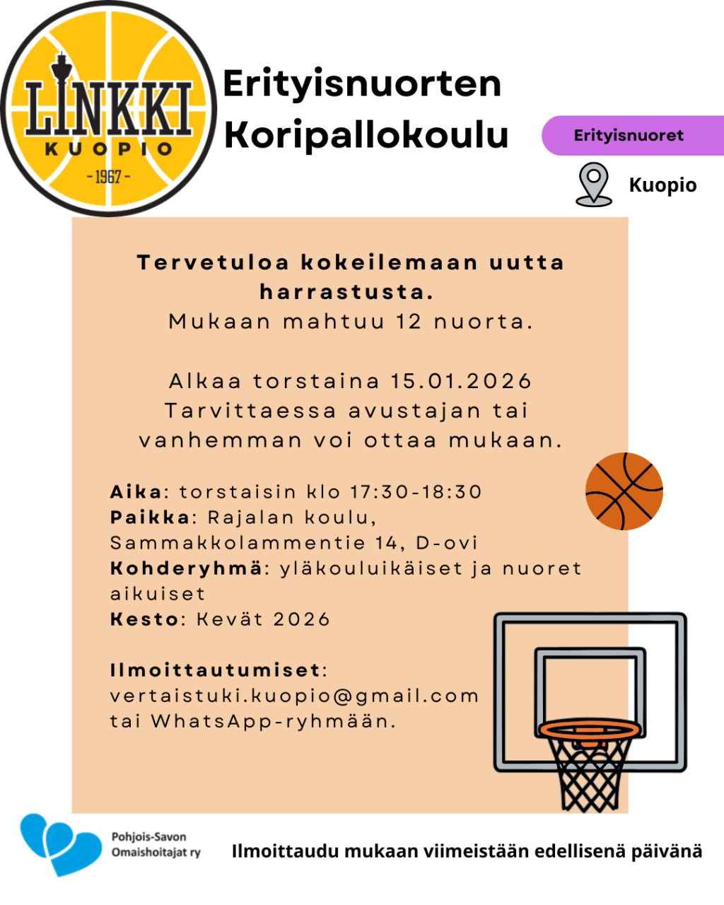 Erityisnuorten Koripallokoulu alkaa torstaina 15.1. klo 17.30-18.30 Rajalan koululla Kuopiossa (Sammakkolammentie 14, D-ovi). Ovet aukeaa klo 17:20. Olethan ajoissa paikalla.