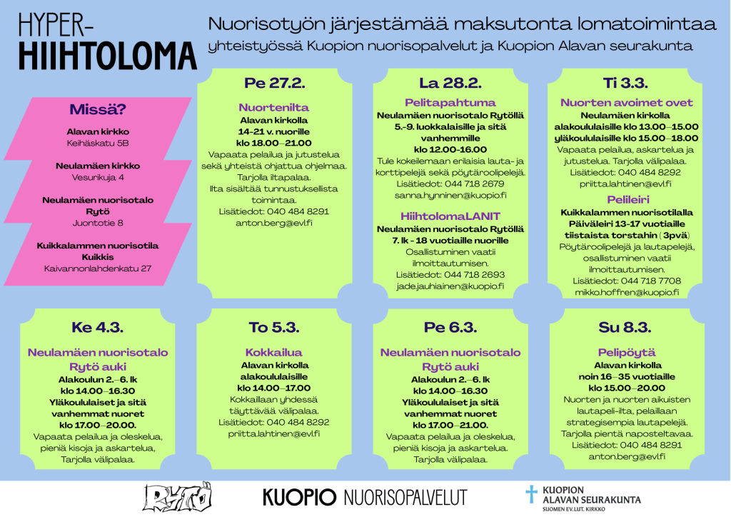Nuorisotyön järjestämää maksutonta lomatoimintaa Neulamäen, Niiralan ja Saaristokaupungin alueilla.