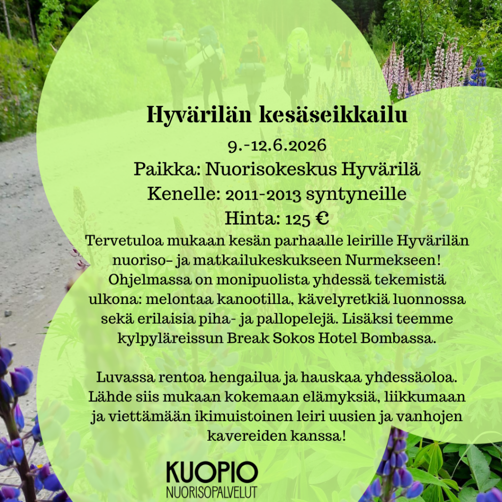 Tervetuloa mukaan Kuopion nuorisopalveluiden järjestämälle kesän parhaalle leirille Hyvärilän nuoriso- ja matkailukeskukseen Nurmekseen! Leiri on ensisijaisesti tarkoitettu kuopiolaisille vuonna 2011-2012 syntyneille kuopiolaisille nuorille.