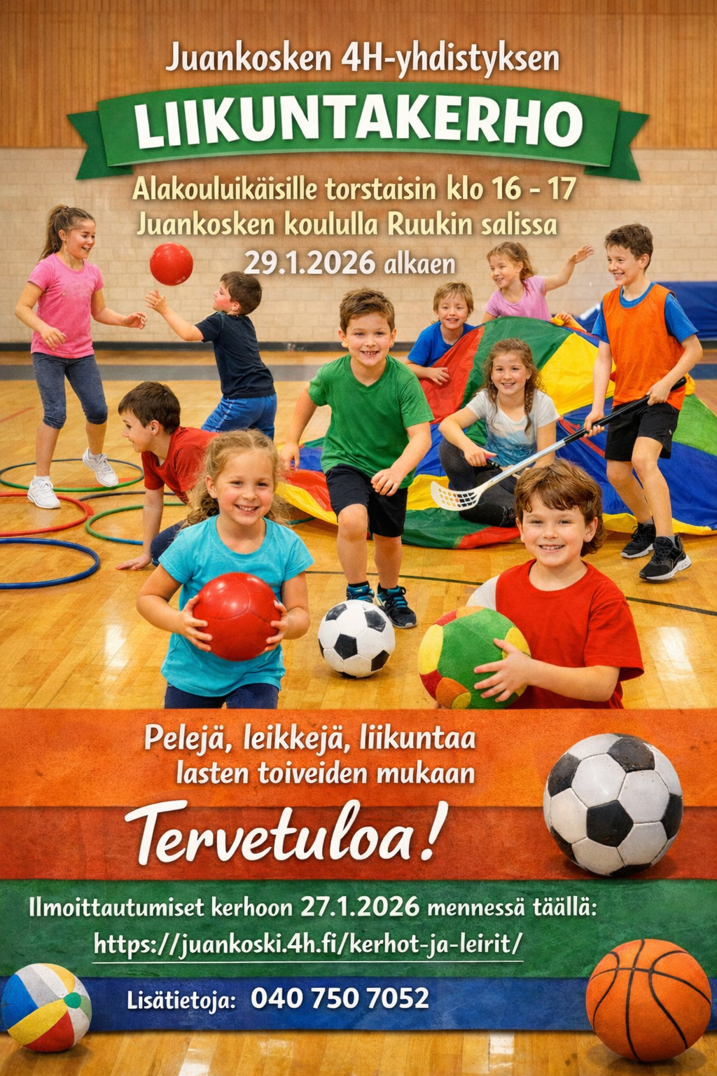 Juankosken 4H-yhdistyksen järjestämä alakouluikäisille (0. – 6. lk) suunnattu liikuntakerho torstaisin 29.1.2026 alkaen klo 16 – 17 Juankosken koululla, Ruukin salissa. Kerhossa pelataan erilaisia pallopelejä, leikitään ja liikutaan lasten toiveiden mukaan.