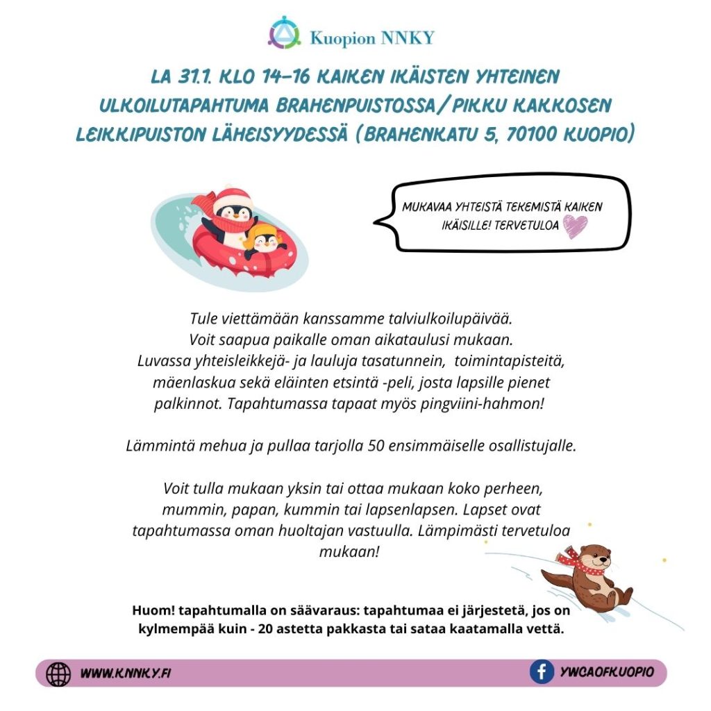 La 31.1. klo 14–16 kaiken ikäisten yhteinen ulkoilutapahtuma Brahenpuistossa/Pikku Kakkosen leikkipuiston läheisyydessä (Brahenkatu 5, 70100 Kuopio)