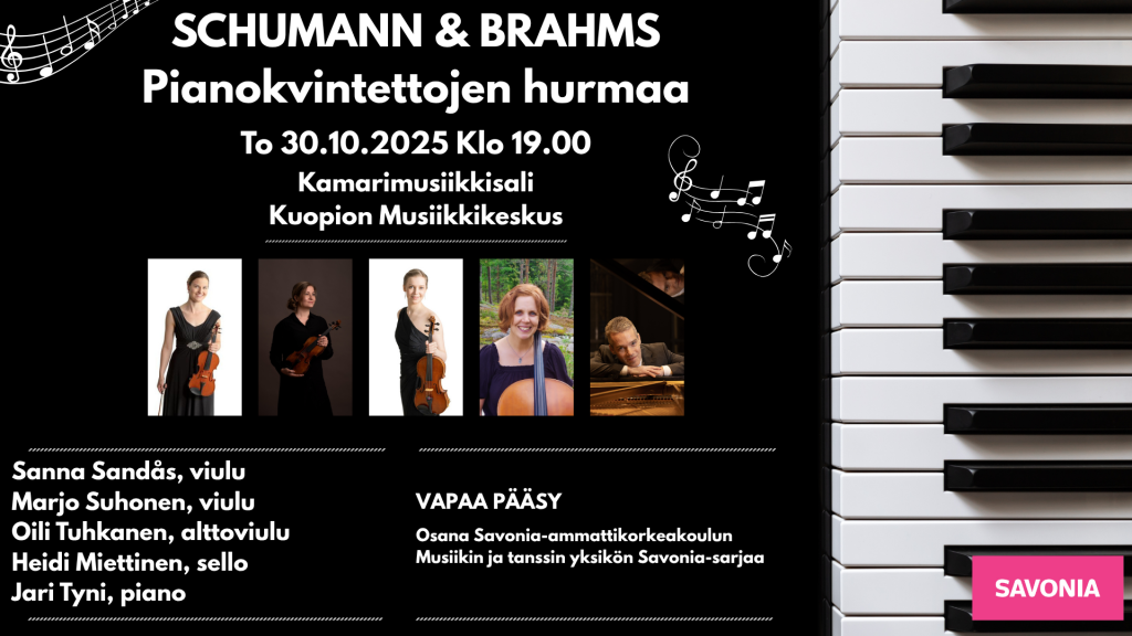 Pianokvintettojen hurmaa on osa Savonia-ammattikorkeakoulun Musiikin ja tanssin yksikön Savonia-sarjaa. Konsertin ohjelmassa ovat kokoonpanon klassikkoteokset. Robert Schumannin (1842) ja Johannes Brahmsin (1864) pianokvintetot kuuluvat säveltäjiensä kamarimusiikkituotannon ehdottomiin helmiin. Musiikki täynnä energiaa, vauhtia ja tunteita – näitä kamarimusiikin mestariteoksia kannattaa tulla kuulemaan!