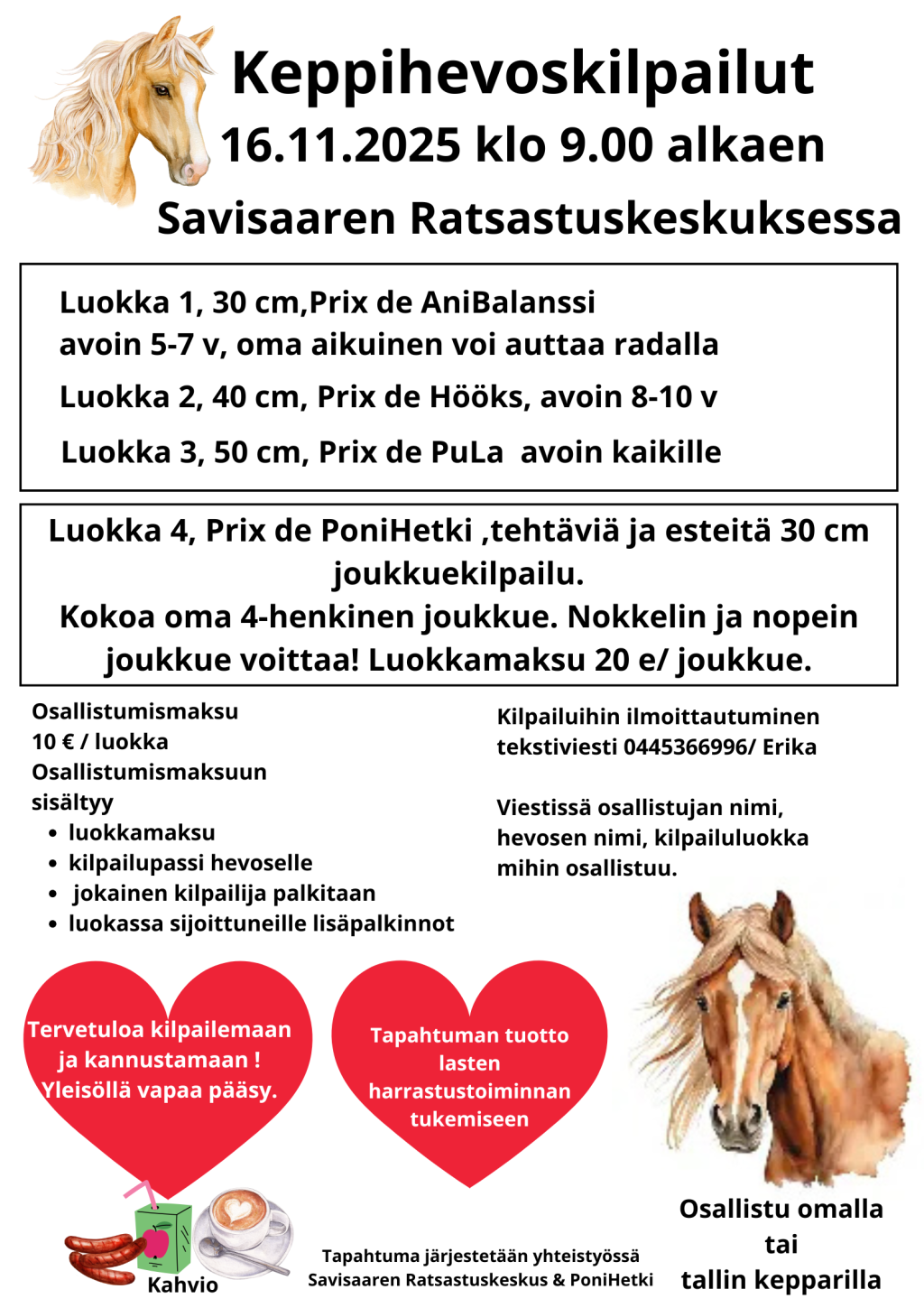 Kilpailuluokkiin on jaossa sponsoripaikkoja. Ne jaetaan taloudellisin perustein. Emme kysy tilitietoja. Sponsoripaikkaa voi hakea vapaamuotoisella tekstiviestillä (Esim. Minna Meikäläinen ilmoittautuu ja hakee sponsoripaikkaa luokkaan 1 ratsullaan Tuisku). Sponsoripaikoissa ei ole omavastuuta.