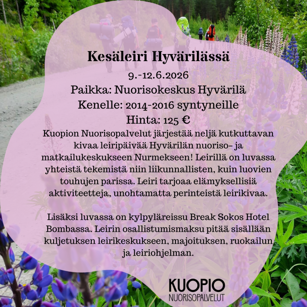 Kuopion Nuorisopalvelut järjestää 2014-2016 syntyneille kuopiolaisille nuorille neljä kutkuttavan kivaa leiripäivää Hyvärilän nuoriso- ja matkailukeskuksessa Nurmeksessa! Leiri on ensisijaisesti tarkoitettu kuopiolaisille vuonna 2015-2017 syntyneille lapsille.