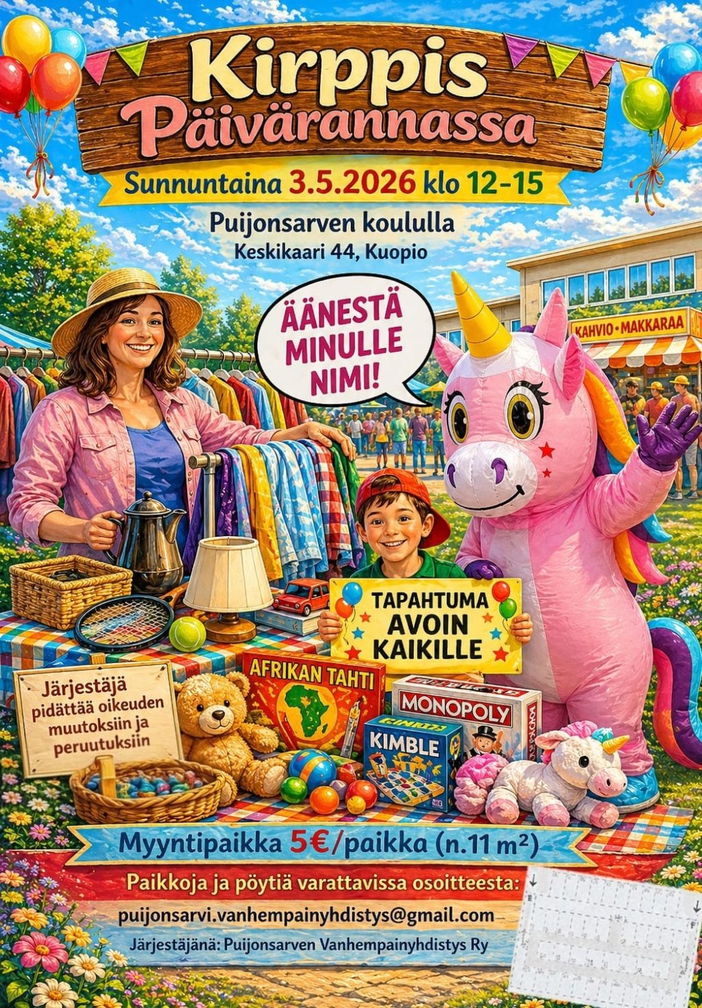 ‼️Puijonsarven koululla liikuntasalissa sekä ulkoalueella 3.5.26 klo 12-15 kaikille avoin KIRPPIS TAPAHTUMA‼️