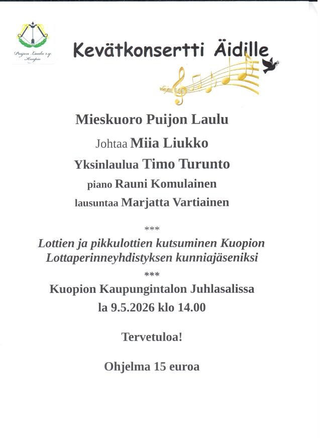 Mieskuoro Puijon laulun “Kevätkonsertin Äidille” la 9.5.2026 klo 14.00 kaupungintalon juhlasalissa
