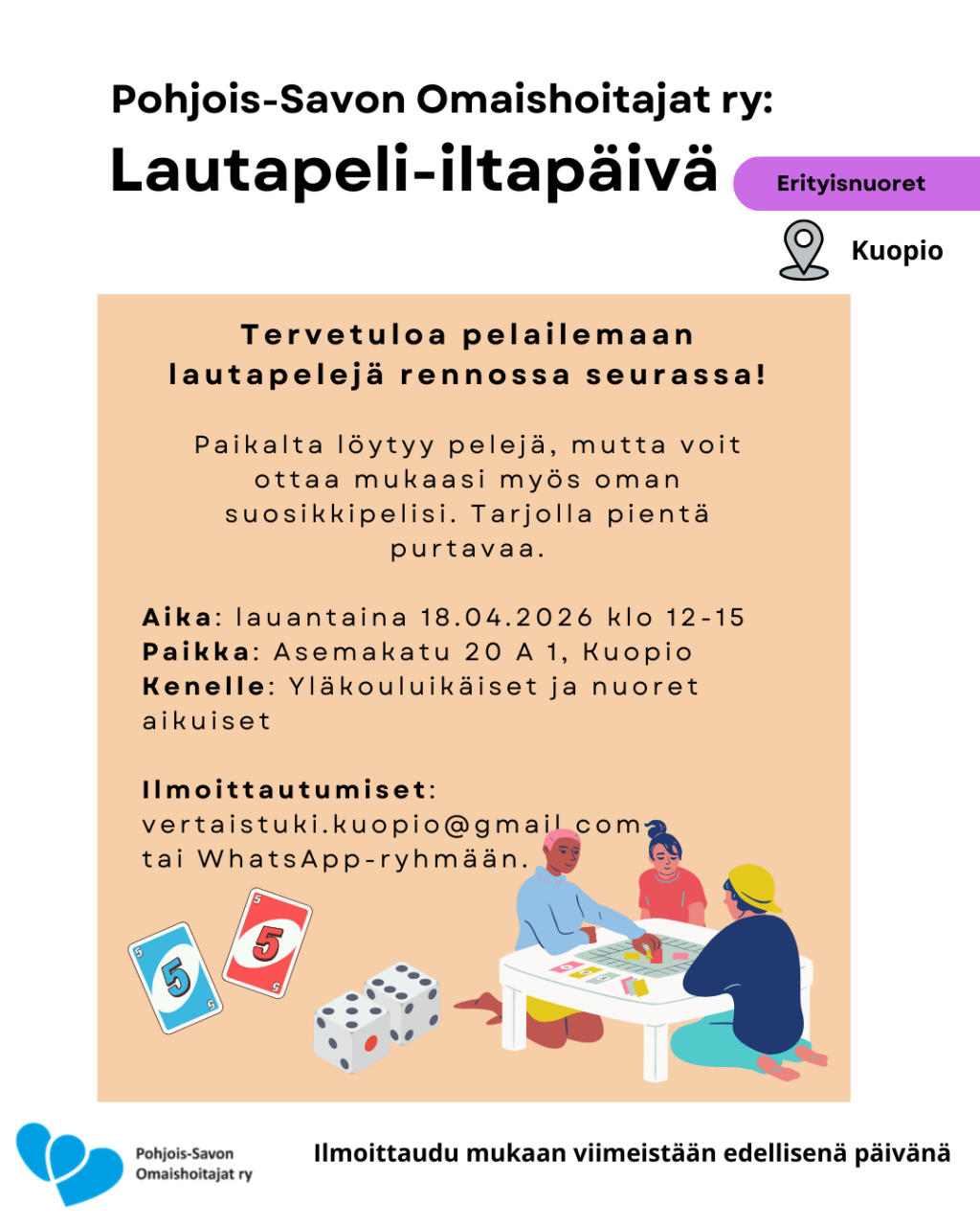 vertaistuki.kuopio@gmail.com tai WA-ryhmään.