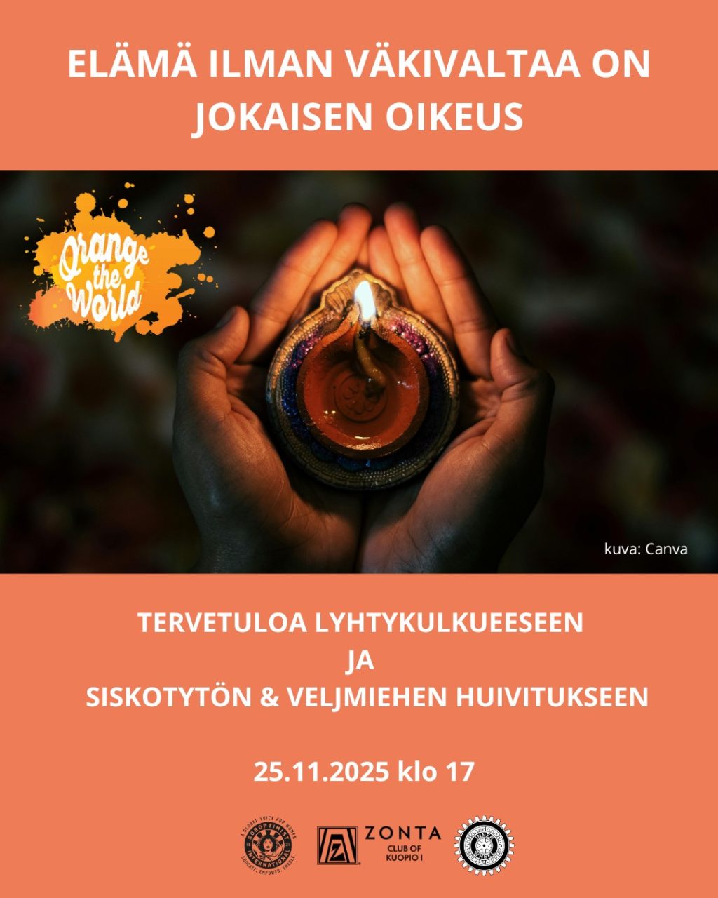 Ota kantaa ja tule mukaan 25 klo 17 lyhtykulkueeseen sekä Siskotytön ja Veljmiehen oranssiksi huivitukseen! Kokoonnumme Siskotyttö patsaalla. Oma lyhty mukaan ja oranssia ylle.