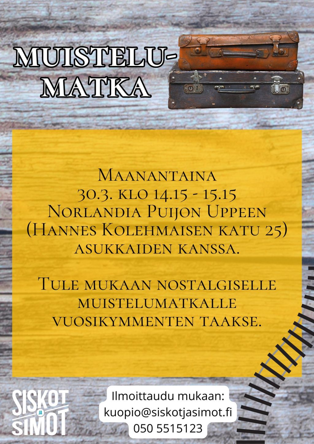 sähköpostilla kuopio@siskotjasimot.fi tai puh: 0505515123