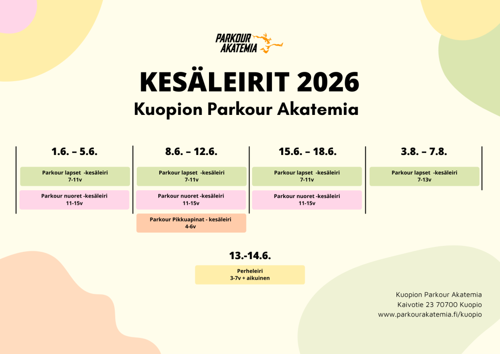 Järjestämme kesäkuun kolmella ensimmäisellä viikolla parkour kesäleirejä 7-15 vuotiaille, 4-6 vuotiaille sekä perheille. Lisäksi elokuussa Back to School -leiri 7-13 vuotiaille.