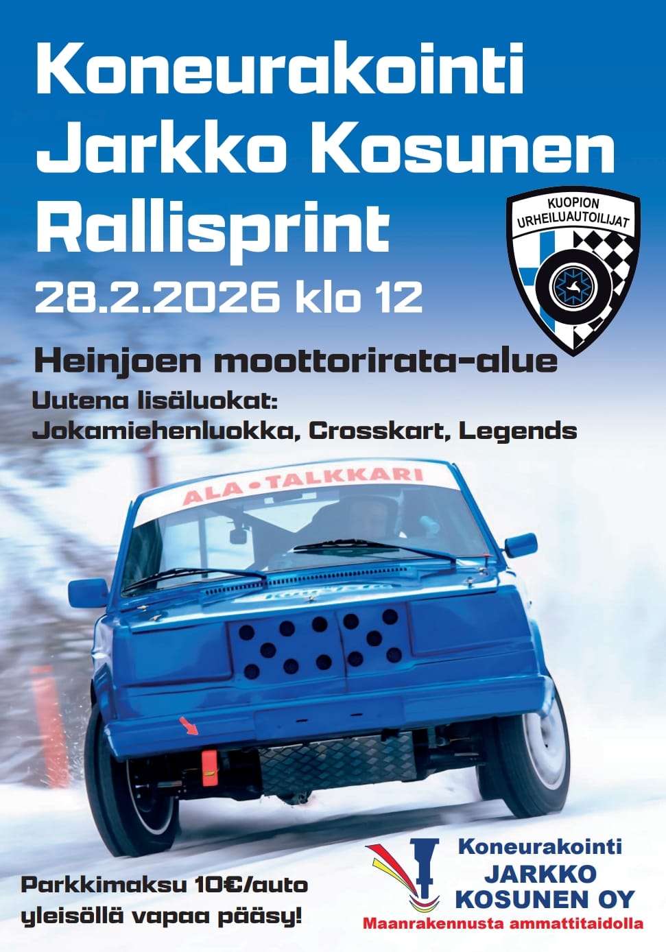 Tule viettämään koko perheen vauhdikasta autourheilupäivä rallisprint-kisaa seuraten! Tapahtumaan on ilmainen sisääpääsy, parkkimaksu 10 euroa/auto.