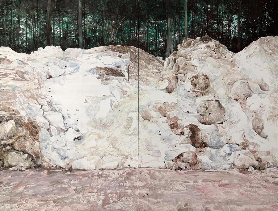 GalleriAssa on nähtävillä teoksia Sanna Kananojan uudesta maalaussarjasta Puolen vuoden vuoristo, jossa hän tarkastelee toiston keinoin lähtökohdan ja maalausprosessin suhdetta valokuvaan pohjautuvassa työskentelyssään. Sarjan jokaisella teoksella on täysin sama lähtökohta, valokuva lumikasasta. Tämä kuva edustaa itsestäänselvää, toimivaa, ihmisen ehdoilla rakennettua ja hyväksyttyä arkiluontoa. Puolen vuoden vuoristo käsittelee lähiluontoa arjen toistuvuuteen, päivien ja hetkien samankaltaisuuteen paneutuen. Asioiden katsomisen ja näkemisen ero on tutulla matkalla selvää. Aiheena on tavallisuus: sen turvallisuus, näkymättömyys ja kyseenalaistamattomuus. Tiet ja niiden vierustat merkitsevät valtavaa määrää maanmuokkausta. Kallioita räjäytetään, puita kaadetaan, maata kaivetaan ja veden virtausta ohjataan. Suurin osa maapallon maapinta-alasta on jo ihmisen toimesta muuttunut. Kananojan teoksissa esiintyvä pieni pala maanpintaa edustaa tätä suurempaa ilmiötä. Maalaussarjan lähtökohtana ovat järjestelmälliset, välttämättömyyden tuloksena syntyneet näkymät – tienvierien lumikasat. Ne tyypittävät maisemaa jopa puolen vuoden ajan. Laakeaan maisemaan kohoaa pieniä vuorimuodostelmia, jotka jatkuvat kilometri toisensa perään samanlaisina. Koneen muodostamia kasoja, samanaikaisesti syntyneitä, kasvaneita, sulaneita, kevään koittaessa ruskeita. Lumikasat ovat paitsi lunta myös soraa, hiekkaa, suolaa ja roskia.