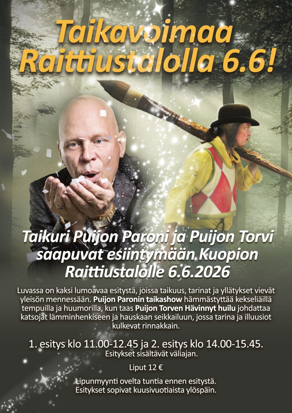 Taikavoimaa Raittiustalolla! Taikuri Puijon Paroni ja Puijon Torvi saapuvat esiintymään Kuopion Raittiustalolle 6.6.2026.