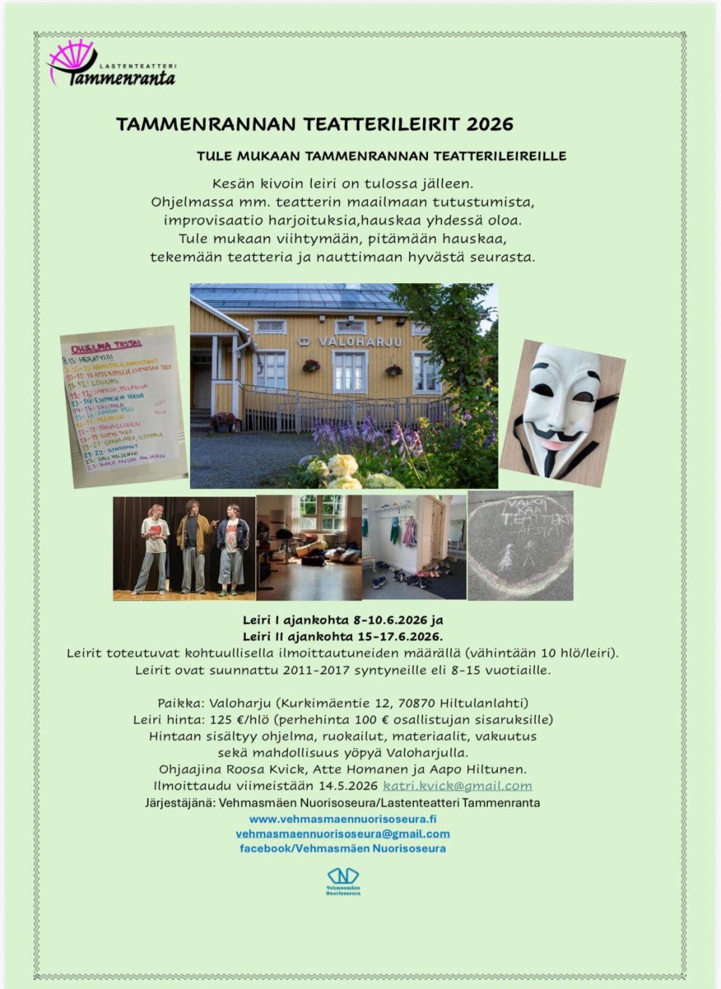 Tule mukaan Tammenrannan teatterileireille. Leirit on suunnattu 2011-2017 syntyneille eli 8-15 vuotiaille. Ohjelmassa mm. teatterin maailmaan tutustumista, improvisaatio harjoituksia, hauskaa yhdessä oloa. Leiri I ajankohta 8-10.6.2026 ja Leiri II ajankohta 15-17.6.2026. Leirit toteutuva kohtuullisella ilmoittautuneiden määrällä (vähintään 10 hlöä/leiri). Paikkana on Valoharju ja 125 € hintaan (perhehinta 100 € osallistujan sisaruksille) sisältyy ohjelma, ruokailut, materiaalit, vakuutus ja mahdollisuus yöpyä Valoharjulla.