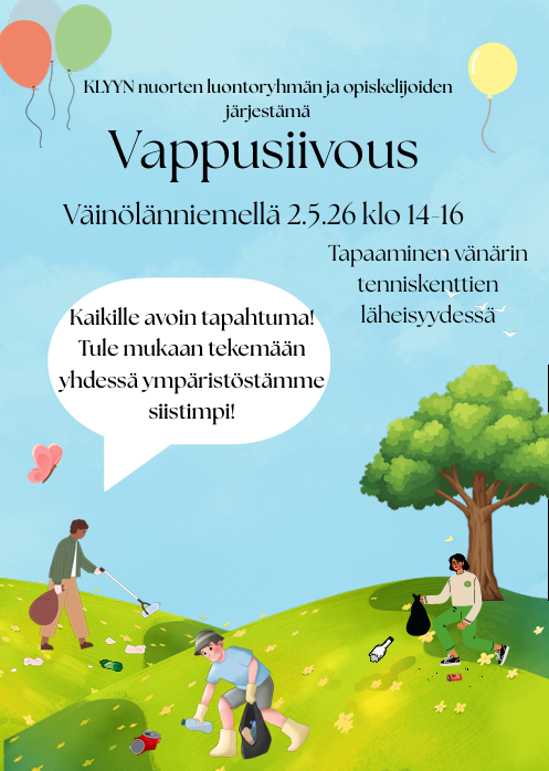 Perinteeksi muodostunut Vappusiivous, eli vapun jälkeinen roskatalkootapahtuma, järjestetään 2.5.2026 klo 14-16 Väinölänniemen ympäristössä. Kaikenikäiset ovat tervetulleita talkoilemaan! Tarjoamme roskapusseja, käsineitä ja roskapihtejä lainaan. Roskien kerääjille on tarjolla pientä evästä ja ensimmäiselle 48 talkoolaiselle ilmainen haalarimerkki kierrätetyistä materiaaleista. Löydät meidät tenniskenttien ja Väinölänniemen parkkipaikan vierestä.