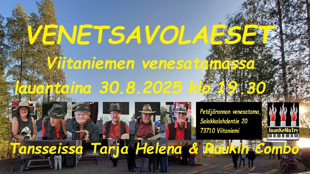 VENETSAVO on perimätiedon mukaan aikoinaan ollut muinaissuomalainen pieni, mutta ponteva ja elinvoimainen kylä Juankosken ja Säyneisen välissä. Nykyisin se on tosin nimetty Viitaniemeksi… TERVETULOA viettämään järjestyksessään jo toisia VENETSAVOLAESIA Viitaniemen venesatamaan lauantaina 30.8.2025 klo 19.30 alkaen! Vapaa pääsy kesäkauden päättäjäisiin, joissa tarjolla on runsaasti juhlatoimikunnan suunnittelemaa ohjelmaa, sekä tietenkin tanssit. Ei muuta kuin tohvelit suihkimaan TARJA HELENA & Ruukin Combon tahdissa!