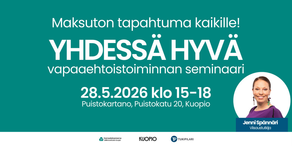 Missä ja milloin? Yhdessä hyvä – vapaaehtoistoiminnan seminaari Puistokartanolla (Puistokatu 20) torstaina 28.5.2026 klo 15-18. Ohjelmassa on puheenvuoroja ja toimijoiden esittelypisteitä. Huom. esittelypisteet ovat avoinna klo 14.30 alkaen Kallavesi-salissa.